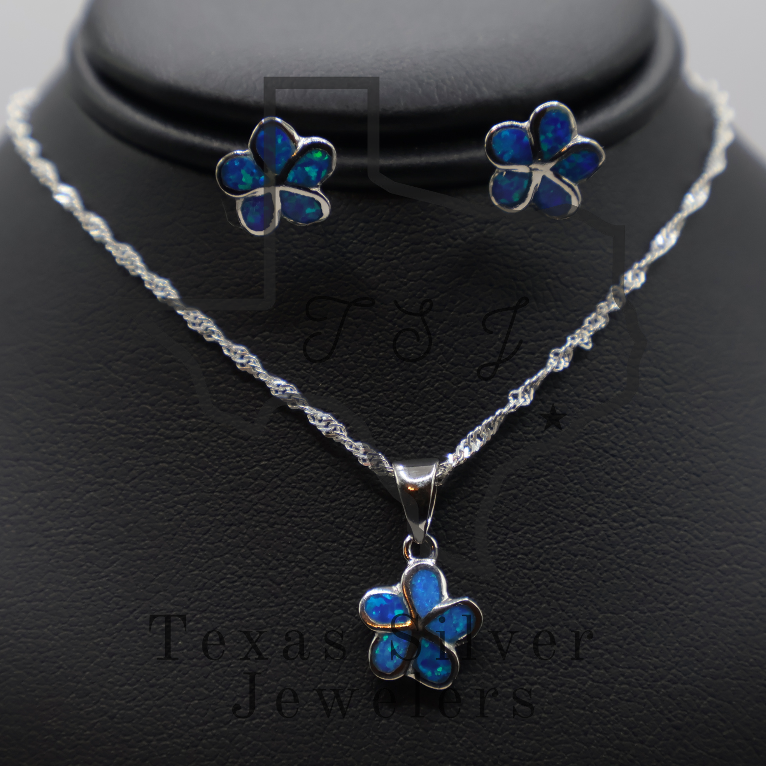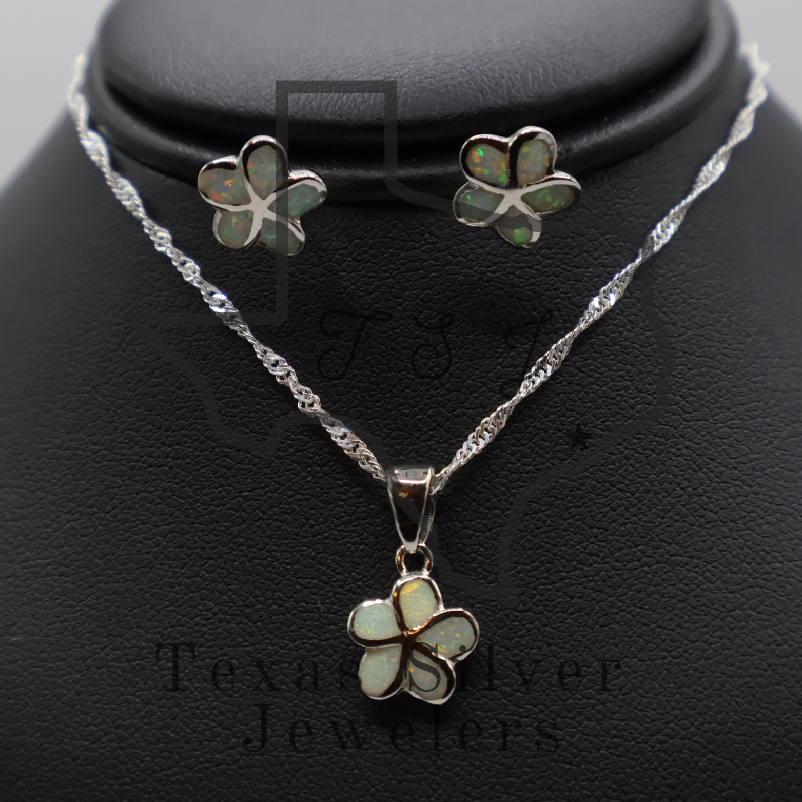 This beautiful set features 1 small flower pendant with opal accents, and two matching size flowers with opal accents. This set is great for any child and is a great way for them to express themselves. The chain for the pendant in the set will either be a 16 or 18 inch Singapore chain based on the customer selected option.